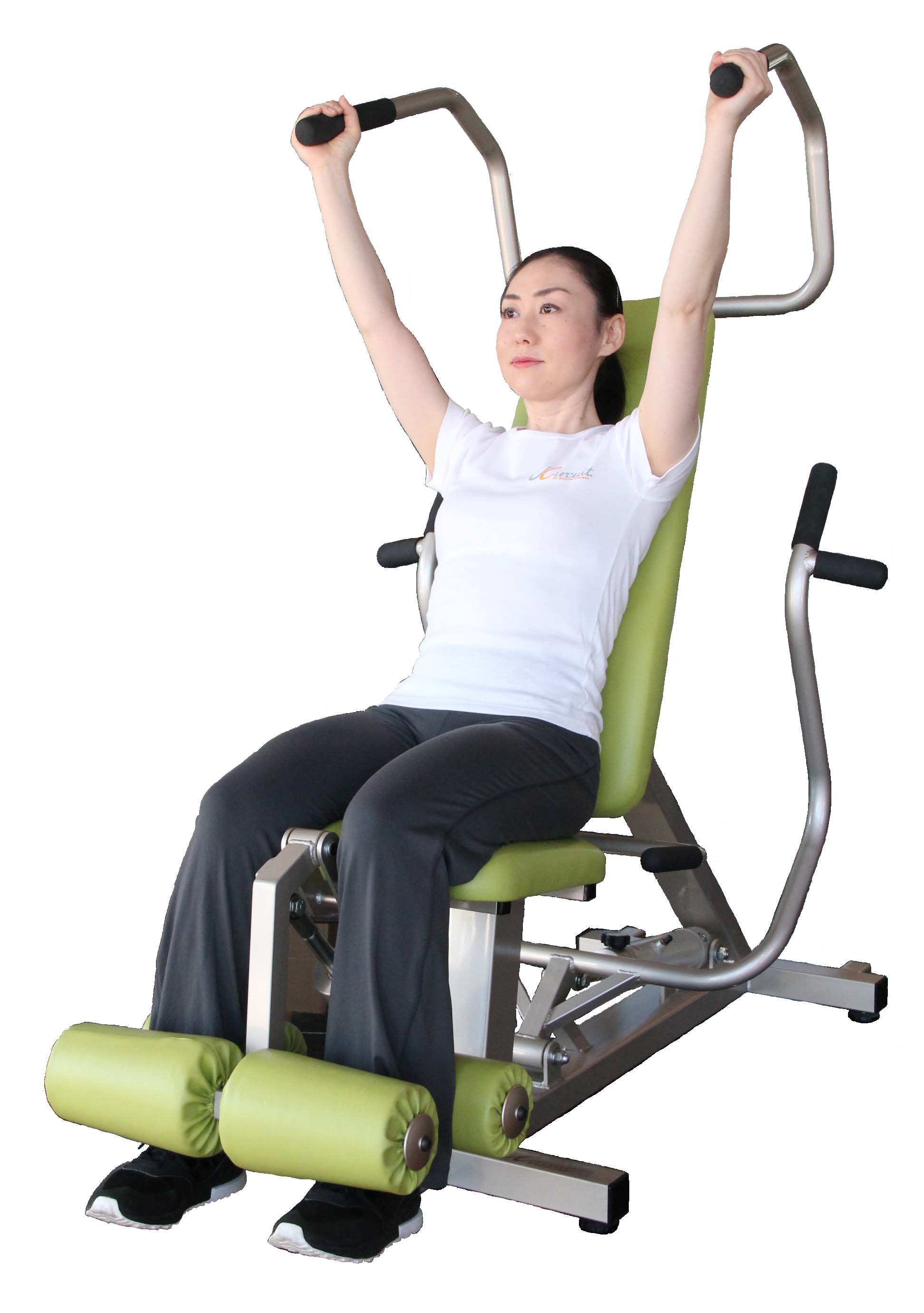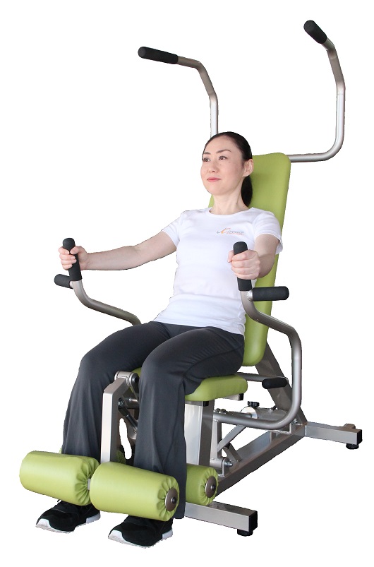 1台で3台分の機能が付いた”All in One"は、移動が困難な方でも多くの筋力運動と、さらには心肺機能を高める有酸素運動もできると、大変ご好評をいただいております。